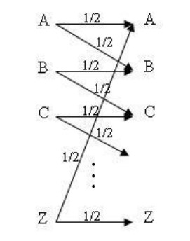 C=H(Y)−H(Y|X)=log(26)−log(2)=log(13)bits